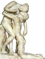 Figura 1: Sakuntala (1888 – Museu Rodin) Esta mesma sensação de movimento é encontrada de forma ainda mais vibrante em “A Valsa” (figura 2), na qual os corpos já se encontram em virtuoso movimento, e embora haja a exploração de um eixo reclinado, há estabilidade pelo contato dos corpos, posição das cabeças e braços. Observa-se a marcação do centro espacial com a união das mãos.